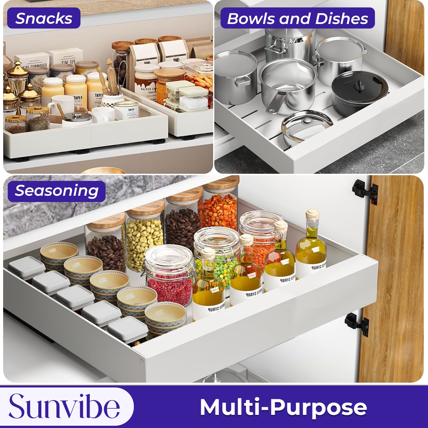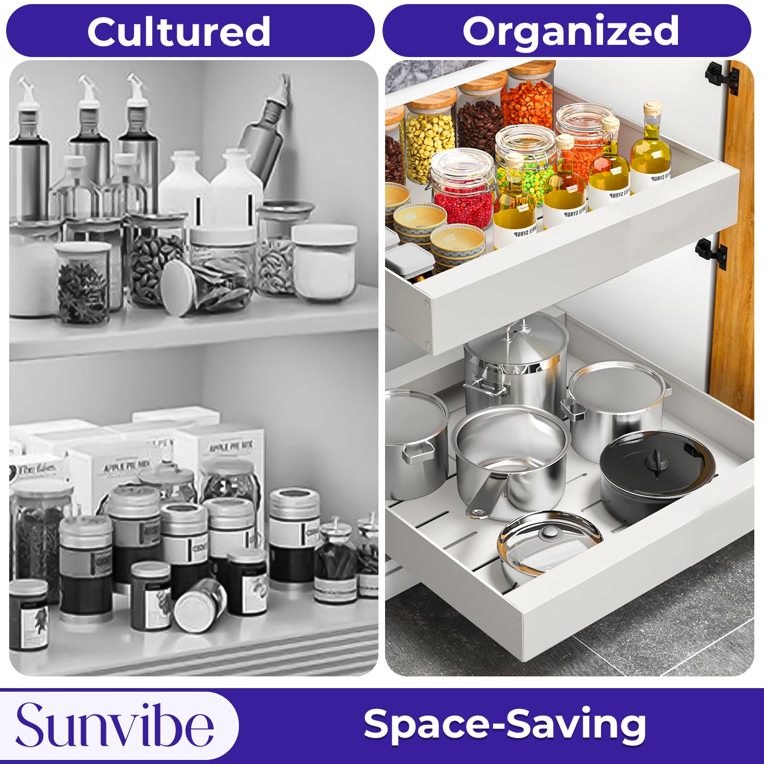 ✅Highly Durable and Rust-Resistant: The sliding storage drawer is heavy-duty carbon steel with excellent sealing and corrosion resistance. The sturdy construction ensures strong load-bearing capacity, while the painted finish of the pantry organizers and storage prevents scratches and rust, maintaining the durability and cleanliness of the shelves. The spice organizer effectively prevents the bottle from moving or sliding, improving overall stability.