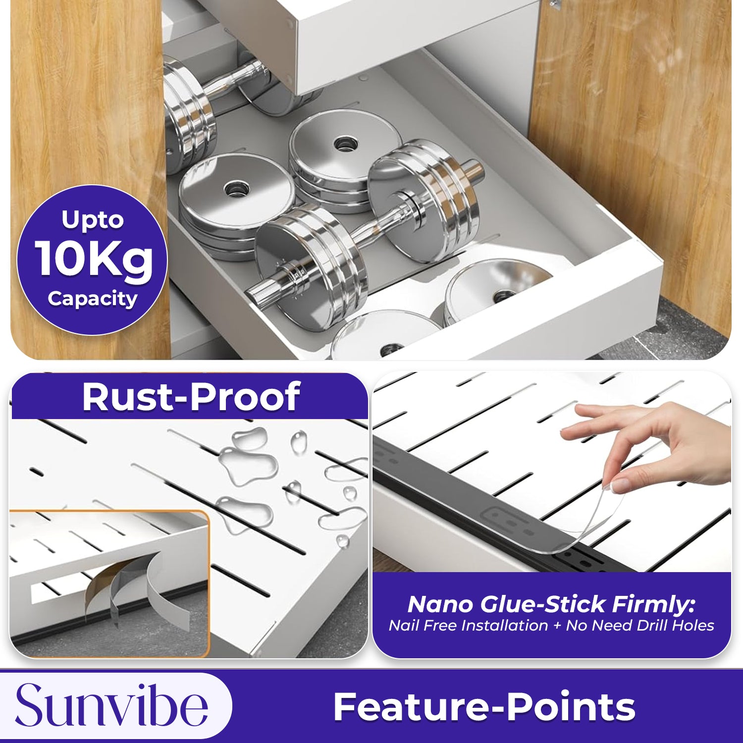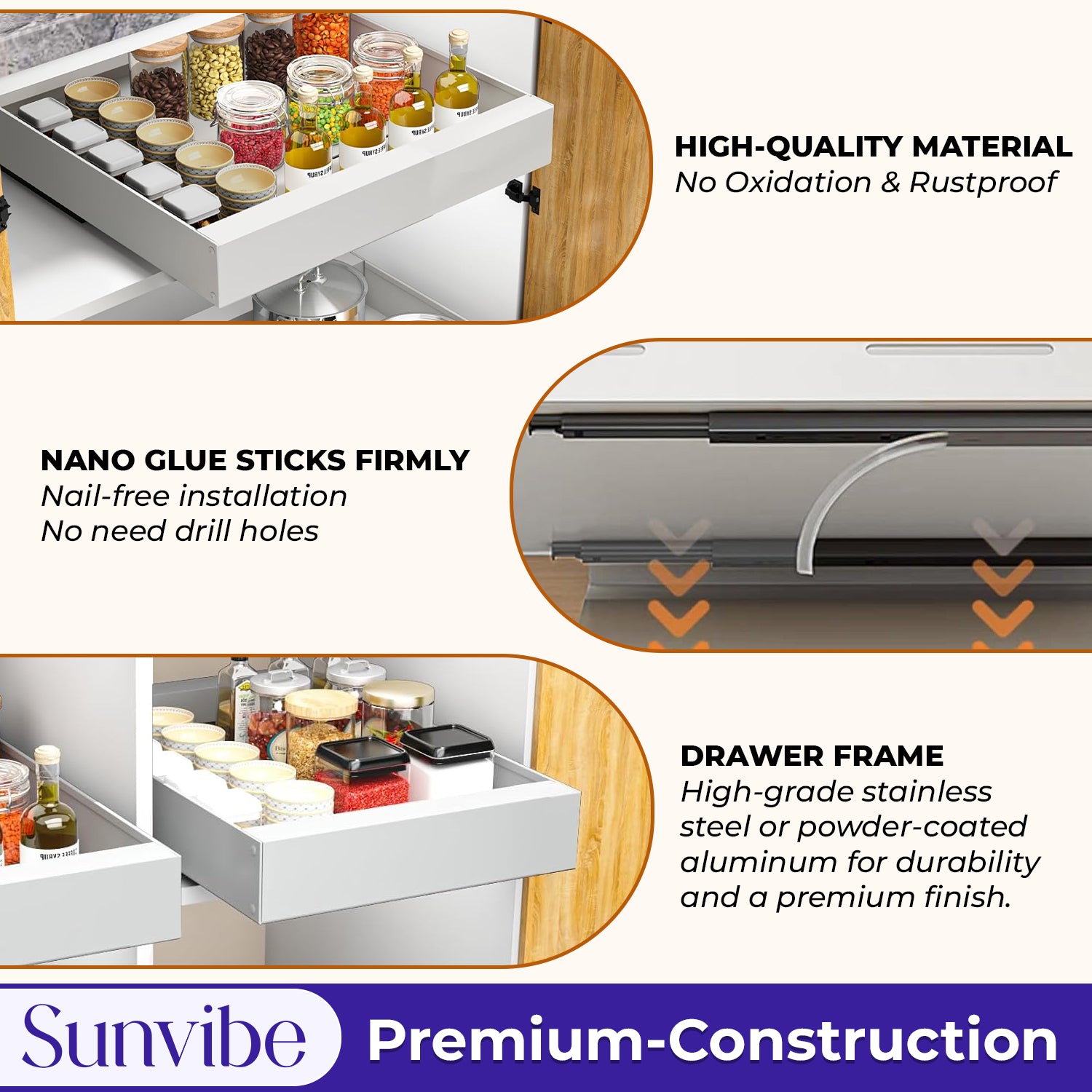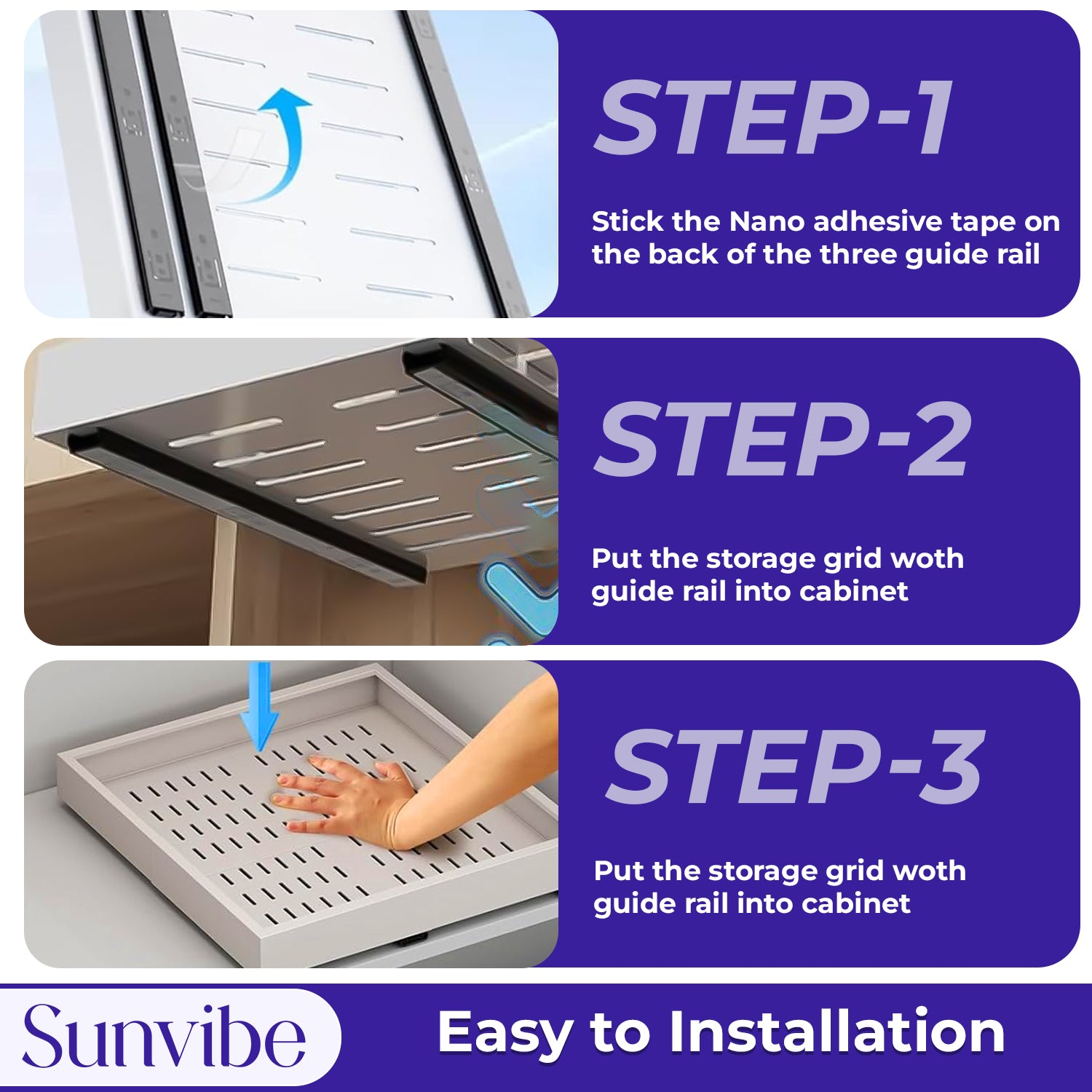 ✅How to Install: Adjustable cabinet drawers without screws focus on user experience, eliminating the need for cumbersome installation steps and tools. Sliding cabinet drawers do not require drilling or nails. By peeling off the nano-adhesive protective film on the guide rail, the organizer can be easily positioned in the cabinet, which greatly reduces the difficulty of installation and allows you to complete the installation yourself quickly, saving time and labor.